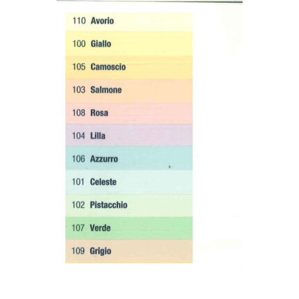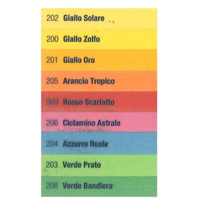 200 GIALLO ZOLFO ,201 GIALLO ORO ,202 GIALLO SOLARE ,203 VERDE PRATO ,204 AZZURRO REALE ,205 ARANCIO TROPICO ,206 CICLAMINO ASTRALE ,208 VERDE BANDIERA ,209 ROSSO SCARLATTO |